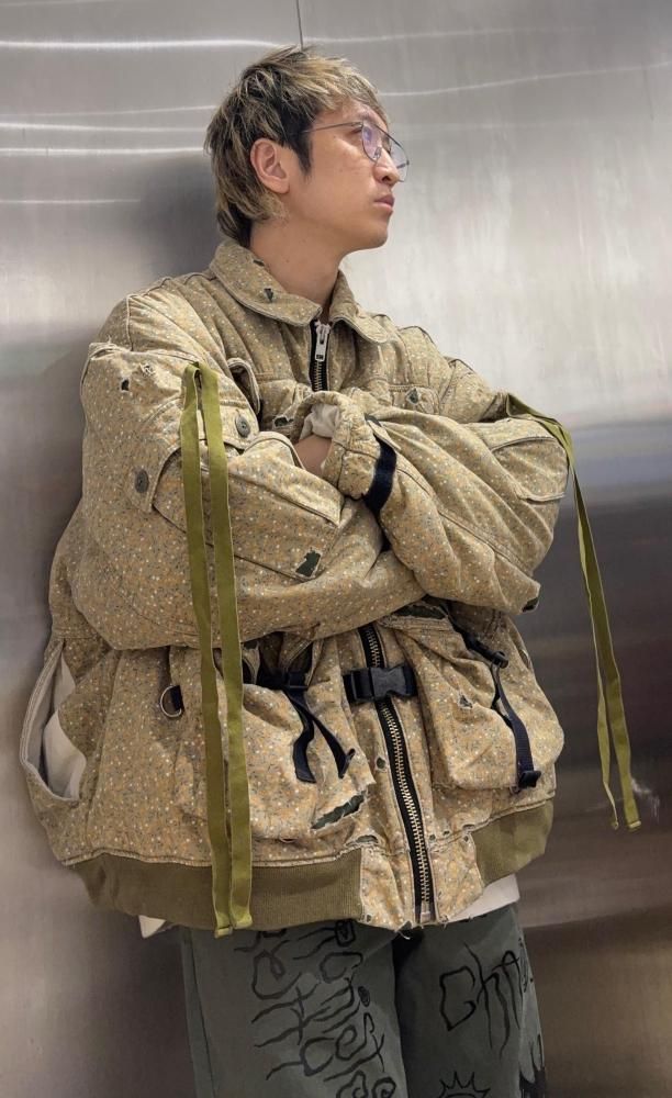 ガーリーな花柄生地に対し、全面にダメージ加工を施すことで退廃的でビンテージ感のる